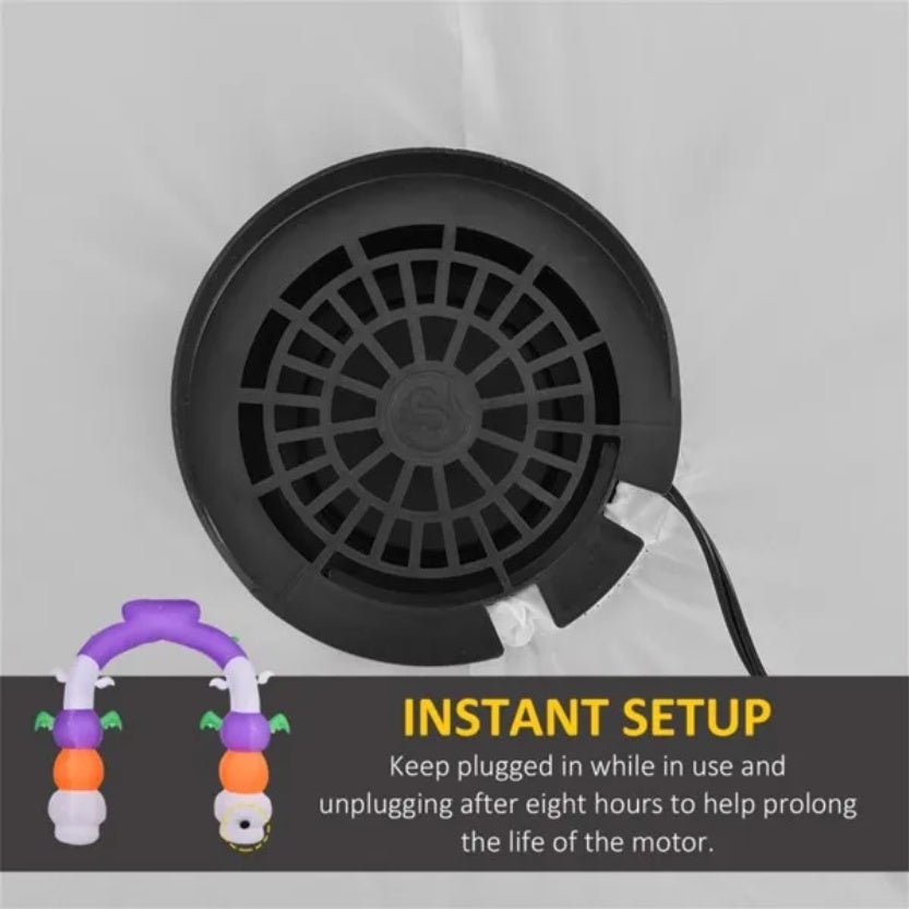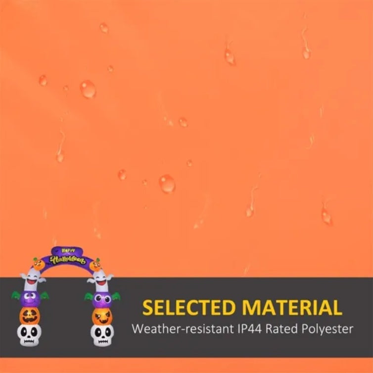 - This 8ft Halloween inflatable archway features colorful pumpkins, skulls, ghosts, and bats. Made of durable polyester, it measures 106" wide, 27" deep, and 94" high. Equipped with 11 LED lights and a powered fan, it must stay plugged in to stay inflated—avoid running longer than eight hours at a time. Designed for spooky settings, it should not be used outdoors in heavy rain, snow, or strong wind.