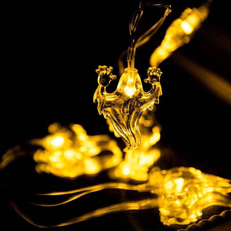 This LED ghost light string is battery-powered, flexible, and safe with cool, bright light. Perfect for spooky Halloween decor, it can be shaped and hung anywhere to create a haunting atmosphere.